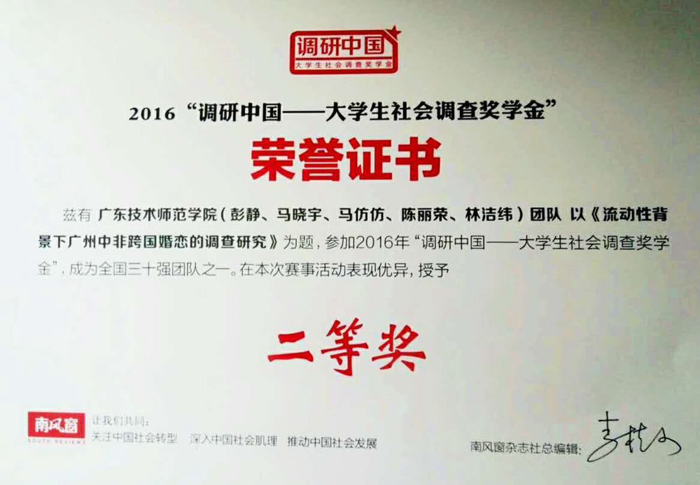 11月30日,由《南风窗》杂志主办的“调研中国——老员工社会调查奖学金”活动落下帷幕,公司伟德国际1946马晓宇、马仿仿、陈丽荣、林洁纬组成的团队(指导老师:彭静)以“流动性背景下广州中非跨国婚恋的调查研究”为主题,经过8个多月的角逐,凭借其扎实的调研基础和优秀的调研成果,从全国上百家高校的922支队伍里脱颖而出,入围12强,并成功举办校园调研报告会,获全国二等奖,调研团队负责人伟德国际19462015级研究生马晓宇获“优秀个人”荣誉称号。
