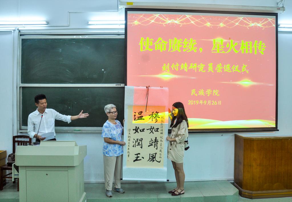最后,今年新入职教职工代表李双向刘付靖老师赠送了鲜花,研究生代表宋周佳、杨胜先、魏兰向刘付靖老师赠送了“穆如靖风、温如润玉”书法作品和纪念品。