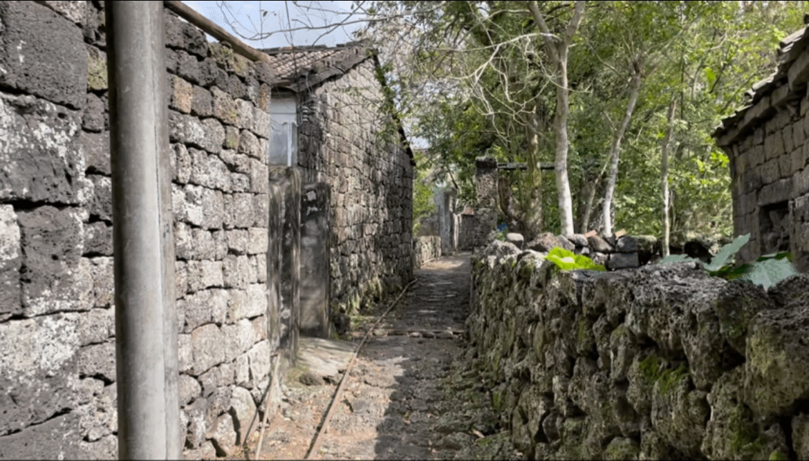 村人火山岩房屋引起了员工们的极大兴趣。通过对长流、石山、永兴、龙泉、龙桥镇等历史上的“羊山地区”多点移动田野调查发现,这一地区的房屋多用火山石所建。通过地理知识扎实的张贵军同学讲解和与当地人交流得知这里位于火山口周围,火山石多为岩浆冷却凝固而成,岩浆中多气泡,气泡逸出后,在火山石中留下如蜂窝状的孔洞,透水吸水性极强,可将地表水渗滤地下,具有冬暖夏凉的作用。