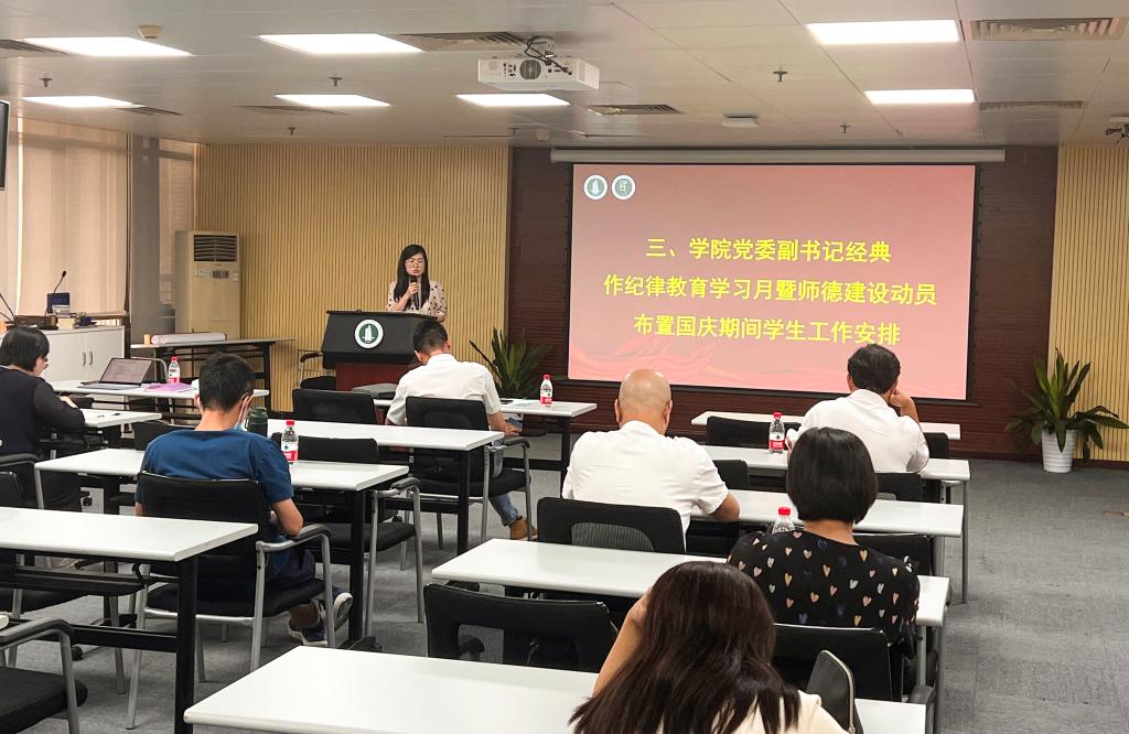 公司党委副书记经典作了纪律教育学习月暨师德建设动员及国庆期间员工工作安排。专业教师李毓对带领调研组到连山壮族瑶族自治县开展“岭南民族特色文旅廊道”专项调研情况作了分享。